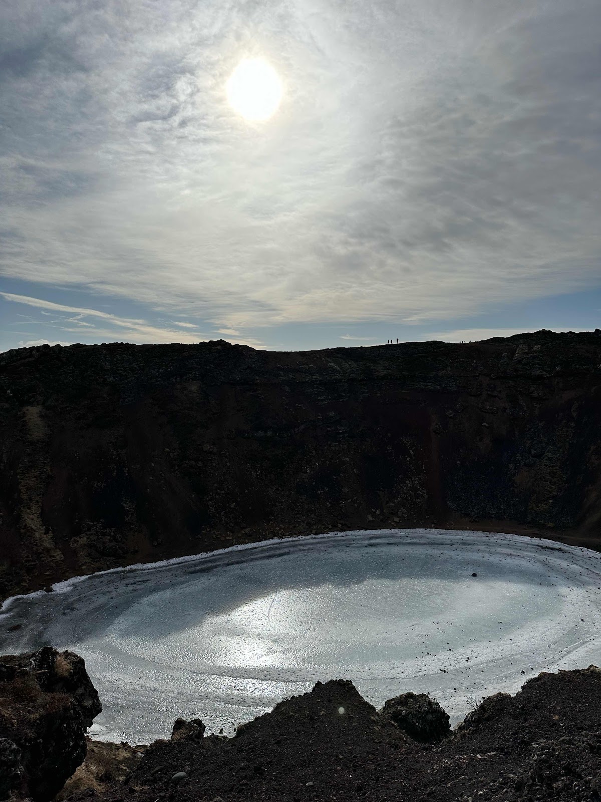 Our first stop was the Kerid Crater which is at the top of a volcano. You can walk all along the top but you can also decent into the crater and there is a frozen over lake too. So no lava and obvi no heat here either. We learned here about more Icelandic folklore-